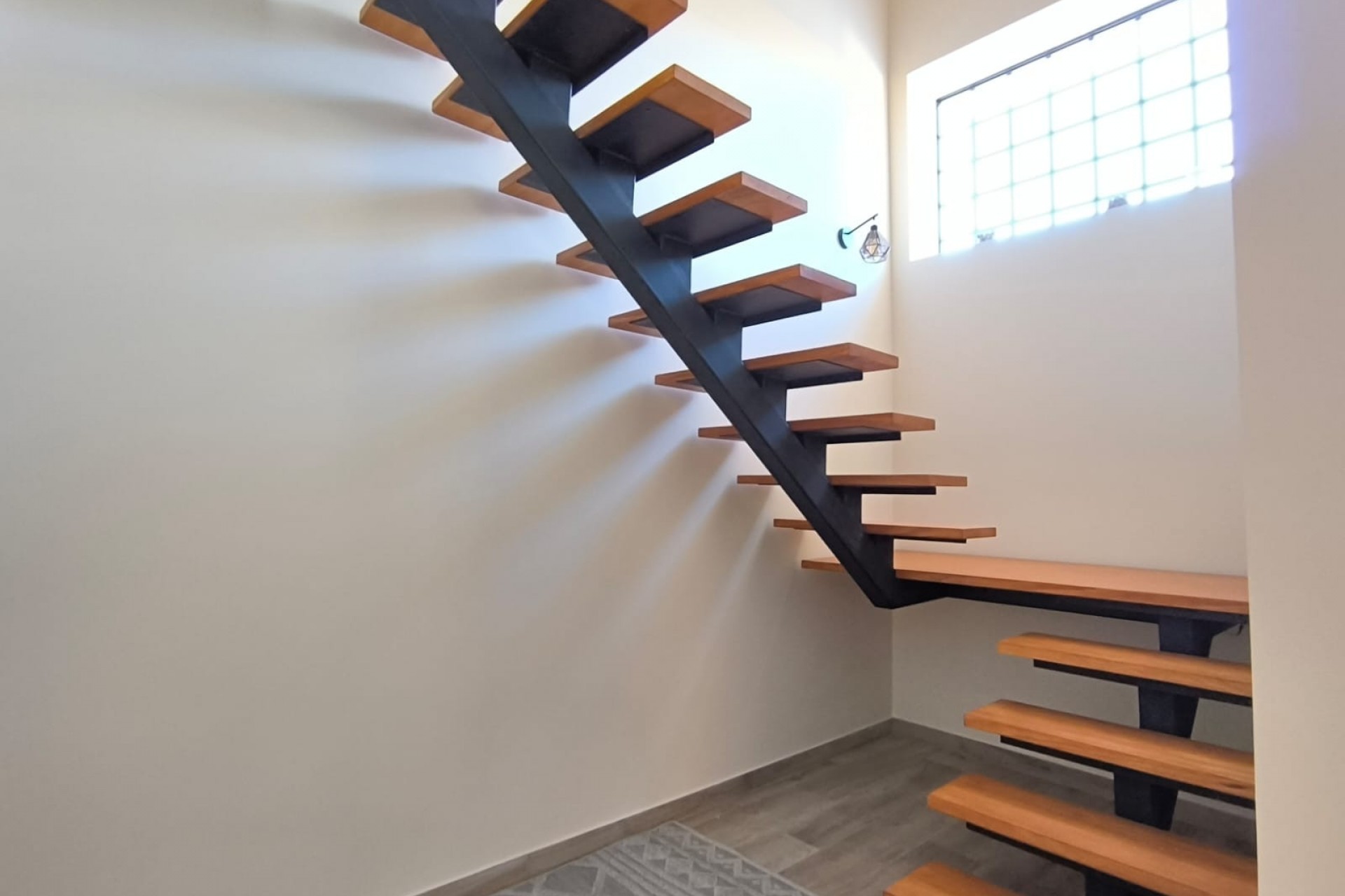 Una escalera flotante con iluminación LED integrada conduce a la primera planta, donde hay dos amplios dormitorios dobles, cada uno con un moderno cuarto de baño con ducha, que ofrecen comodidad y privacidad para la familia o los invitados.