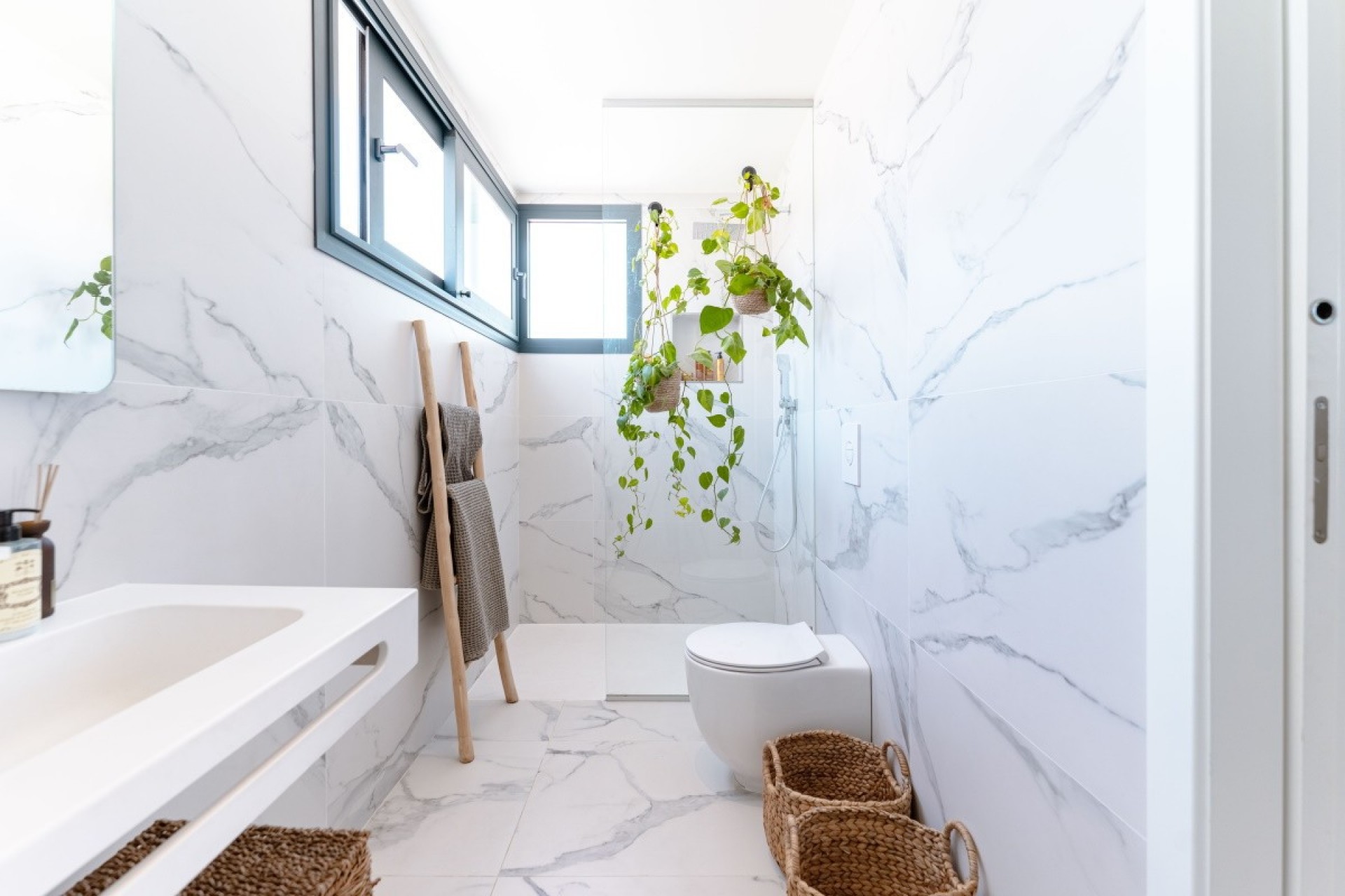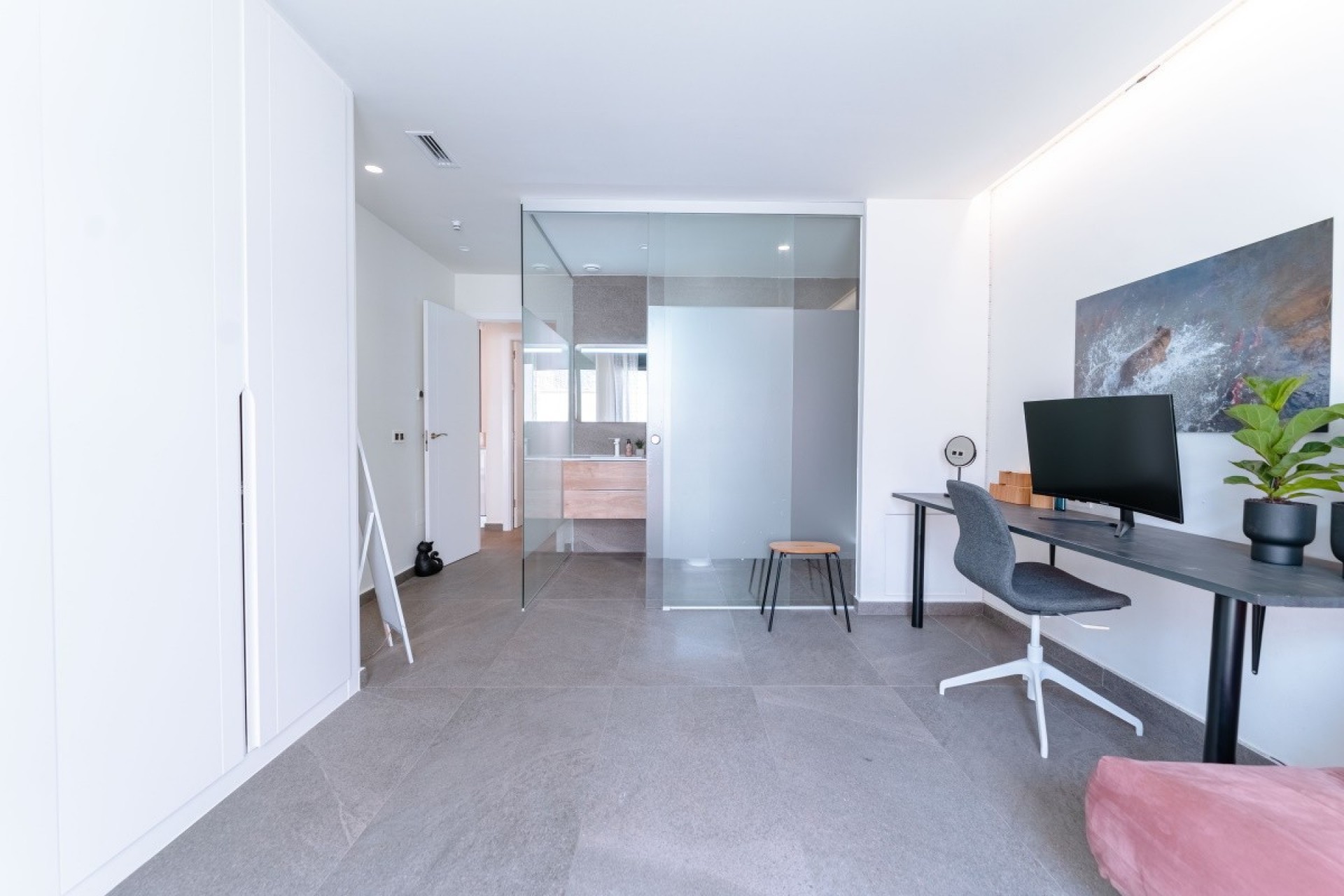 Na pierwszym piętrze znajdują się dwie sypialnie z garderobami i miejscem na podwójne łóżko. Jedna sypialnia ma wyjście na prywatny taras, a druga to duża sypialnia z garderobą, łazienką i panoramicznymi oknami. Do dyspozycji Gości jest również piękna łazienka z prysznicem, bidetem i wanną z funkcją jacuzzi, a także wyjście na prywatny taras z korytarza. Oba tarasy na pierwszym piętrze oferują miejsce na meble wypoczynkowe lub stół jadalny.