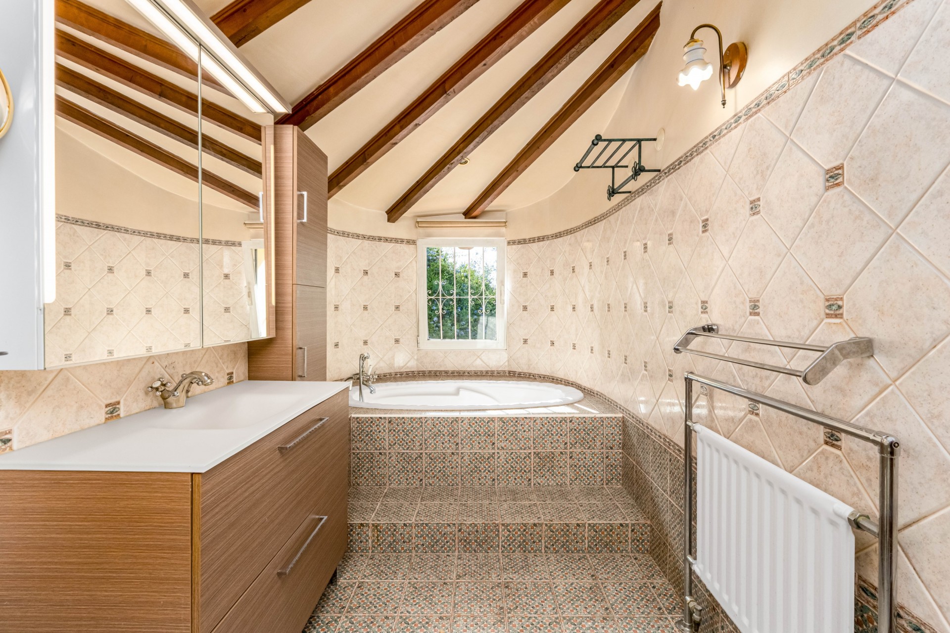 The villa features four comfortable bedrooms and three stylish bathrooms, while the lower level includes an additional versatile room ideal as a guest suite, office, or fifth bedroom. Outdoors, the beautifully maintained garden offers complete privacy and ample parking.