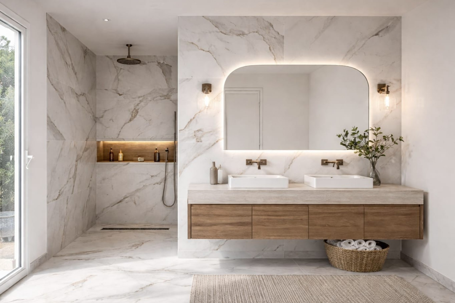 The villa offers four bedrooms and four bathrooms in total. The lower floor includes a bedroom, two bathrooms and a lounge area, which can easily function as a private guesthouse for visitors or extended family, providing additional independence and flexibility.
