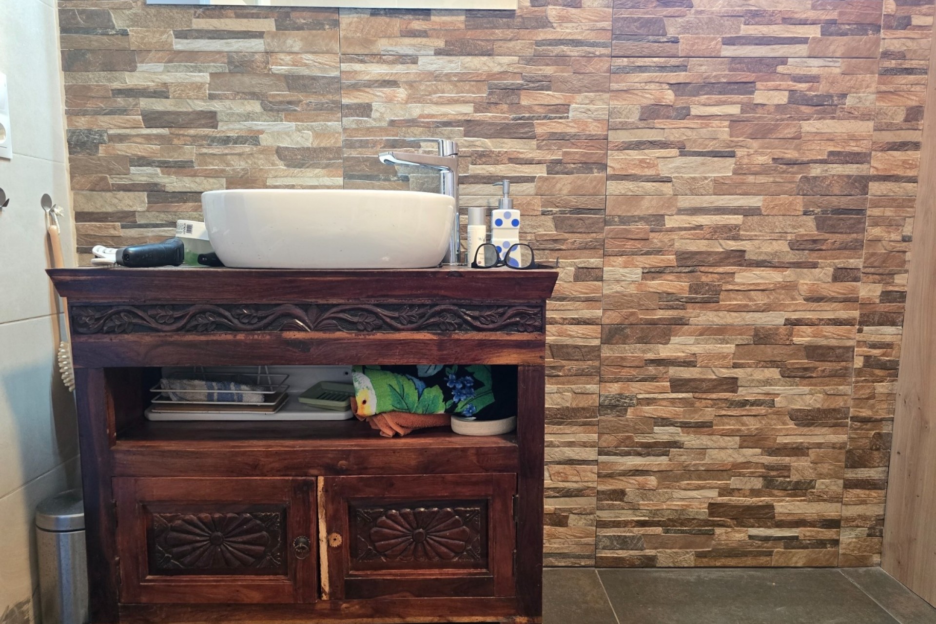 The open kitchen is directly connected to the living space and offers a practical and social layout. Next to the kitchen, a warm and inviting covered porch-style lounge creates a lovely transitional space between inside and outside, perfect for relaxing, reading or enjoying a morning coffee while overlooking the garden.