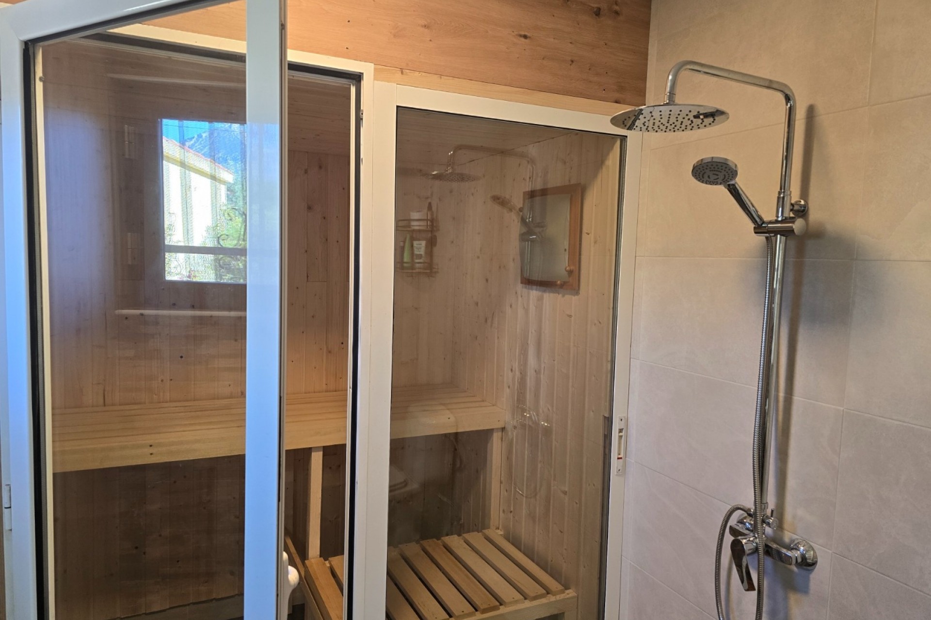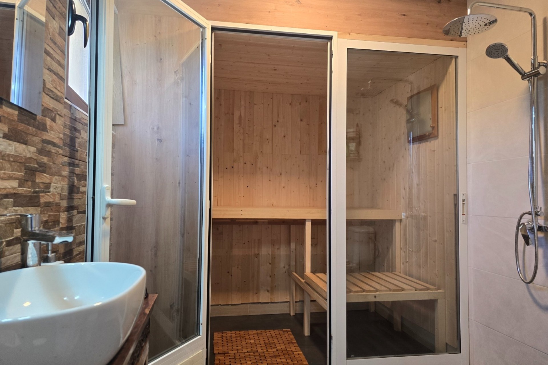 The home features three comfortable bedrooms and two bathrooms. One of the bathrooms includes a private sauna, creating a relaxing wellness space within the house.